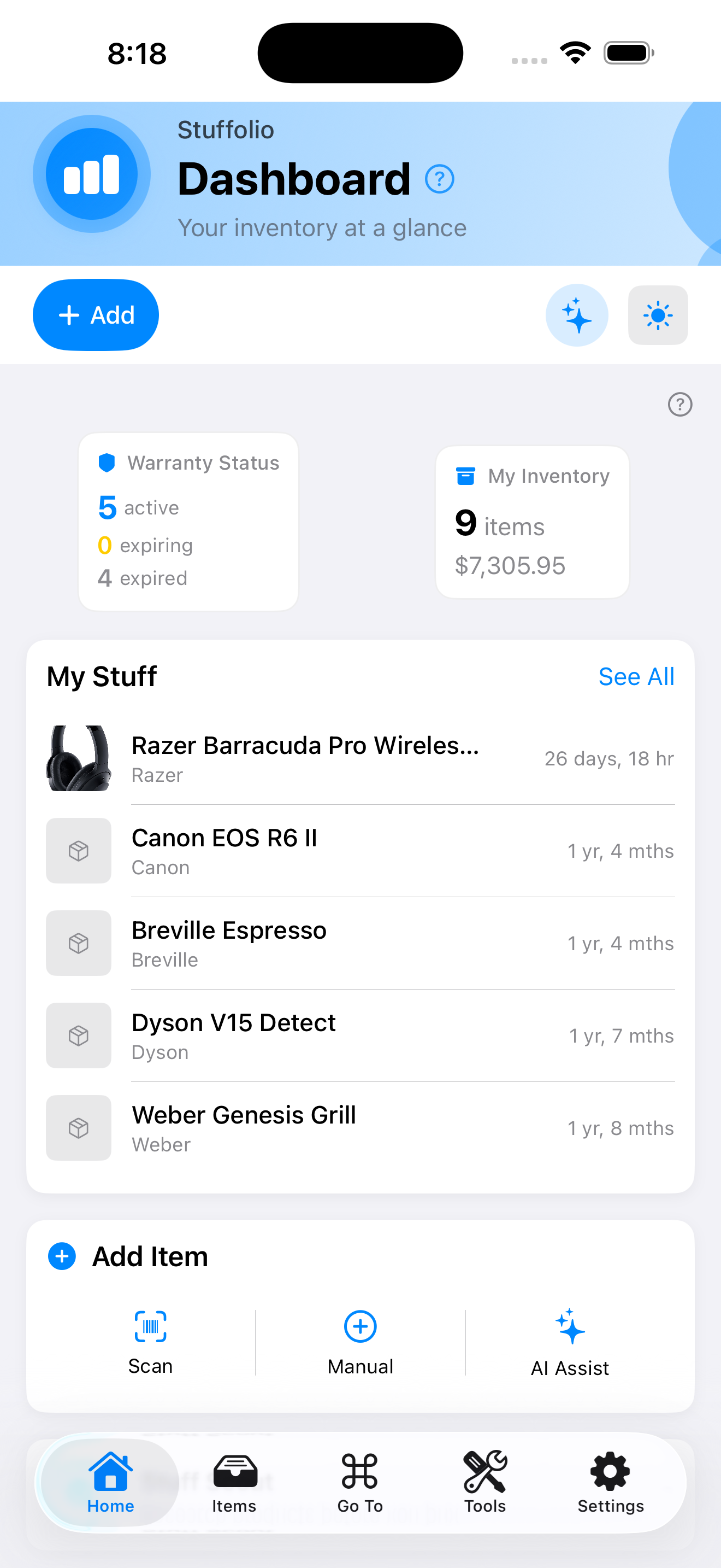 The "aha" moment: That 3-year warranty on your fridge? Year 1 might be full coverage. Year 2-3 might be parts only. Most apps just show "expires 2027." Stuffolio shows you when your coverage actually changes.